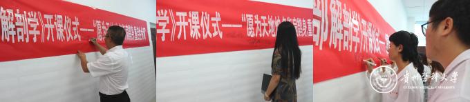 最后,全体师生在横幅上签字,以表对大体老师的尊重和从事医学事业的决心。自课程思政教学改革实施以来,每年不同主题的局解开课仪式已经成为了学校的传统,此次以“愿为天地炉,多衔扁鹊身,重启生命源”为主题,使学生深刻领悟到了医学事业的内涵和意义,同时让学生认知生命的意义,领悟奉献的精神,体会勇于担当的勇气,实现医学教育、思想教育和人文教育的在实践教学中相互契合。
