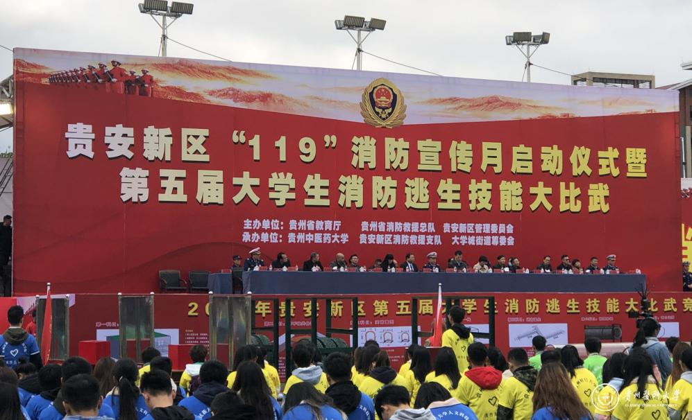 11月6日,由贵州省教育厅、贵州省消防救援总队、贵安新区管委会主办,贵州中医药大学、贵安新区社会事务协调局、大学城街道筹委会、贵安新区消防救援支队承办,贵州广播电视台协办的贵安新区“119”消防宣传月启动仪式暨第五届大学生消防逃生技能大比武活动在贵州中医药大学大学城校区举行。