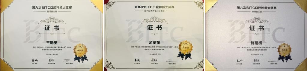 三位研究生经过认真准备和努力,最终孟茂花的参赛病例“数字化腓骨肌皮瓣重建右侧下颌骨缺损后种植覆盖义齿修复”荣获牙列缺失种植治疗主题赛区三等奖,王勤英的参赛病例“右上中切牙L-shape技术骨增量及隧道法软组织增量后种植修复”和陈镜桥的参赛病例“右上中切牙mucograft位点保存后延期种植修复”获骨增量主题赛区优胜奖。