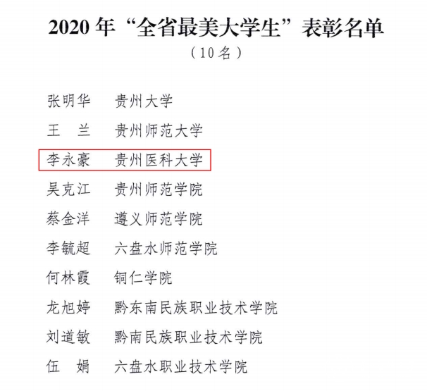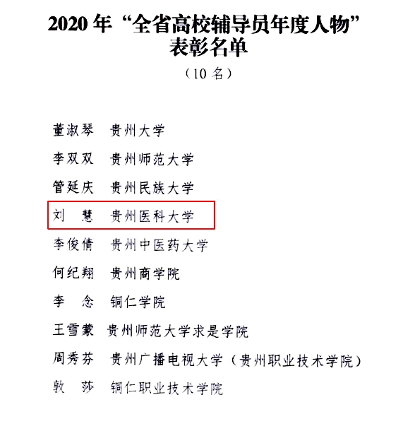 近日,省委宣传部、省委教育工委、省教育厅公布了2020年贵州省“高校辅导员年度人物”“高校辅导员年度人物提名”和“大学生年度人物”“大学生年度人物提名”和2020年贵州省“最美高校辅导员”“最美大学生”“最美乡村教师”表彰名单。beat365基础医学院辅导员刘慧获评2020年“全省高校辅导员年度人物”,药学院学生李永豪获评2020年“全省最美大学生”。