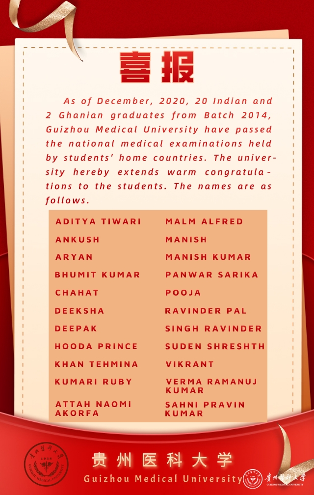 2014级临床医学专业来华留学生是beat365首届国际学生,在册学生人数为44人。截至2020年12月,在参加本国执业医师资格考试中,20名印度毕业生和2名加纳毕业生顺利通过,通过率达50%。beat365来华留学毕业生所取得的优异成绩,不仅给在校留学生带来极大的鼓舞,也是对beat365坚定发展国际教育的肯定。