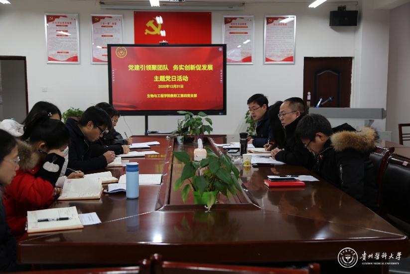 曾柱发言指出,基层党支部要发挥好引领带动作用,要组织党员和教师认真学习党的十九届五中全会及省委十二届八次全会的精神,贯彻落实“推动高质量发展”的有关要求,以高质量党建推动教研室、学院和学校教育事业的高质量发展。同时,对今后的工作提出要求,一是党员要不断提升自身的业务水平和综合能力,积极进取、开拓创新、追求卓越,尽快适应学校追求更高质量发展的要求;二是党员要有大局意识和集体荣誉感,主动担当作为,着力推动学科的内涵建设;三是党员要加强理论学习,提升思想境界的高度,着眼于学校的发展战略,努力在“双一流”和“双万”计划中有所建树,并立足贵州省“三大战略行动”,做好社会服务工作。