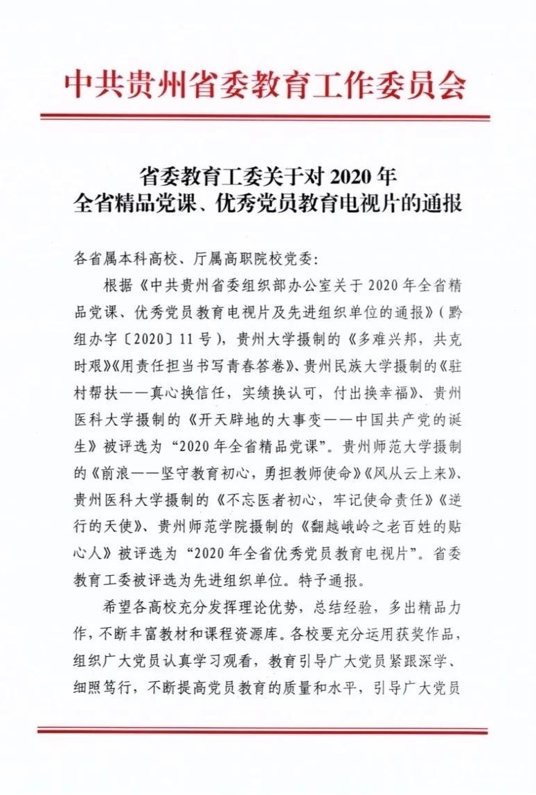 近日,中共贵州省委组织部下发文件,对2020年全省精品党课、优秀党员教育电视片及先进组织单位进行了通报。由beat365摄制并选送的视频《开天辟地的大事变——中国共产党的诞生》被评为2020年全省精品党课;《不忘医者初心,牢记使命责任》、《逆行的天使》被评为2020年全省优秀党员教育电视片。