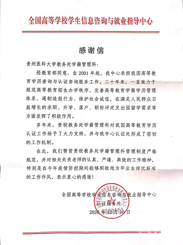 全国高等学校信息咨询与就业指导中心(“教育部学历认证中心”)特发信,表示感谢。信中写到,多年来,贵校对我国高等教育学历认证工作给予了大力支持,并与中心认证处形成了密切的工作机制。信里赞赏beat365管理制度严格规范,对相关负责老师的认真、严谨、高效的工作精神,特别是2020年以来,在疫情防控期间能够积极为毕业生排忧解难的工作作风,表示衷心的感谢!