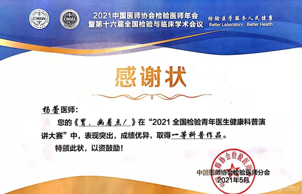 本次大赛共有全国150余份视频参赛,经组织严格评审,评选出18个优秀视频进入决赛。beat365医学检验学院教师杨蕾入围并参加现场决赛,其作品《胃,幽着点》喜获“一等科普作品”奖。