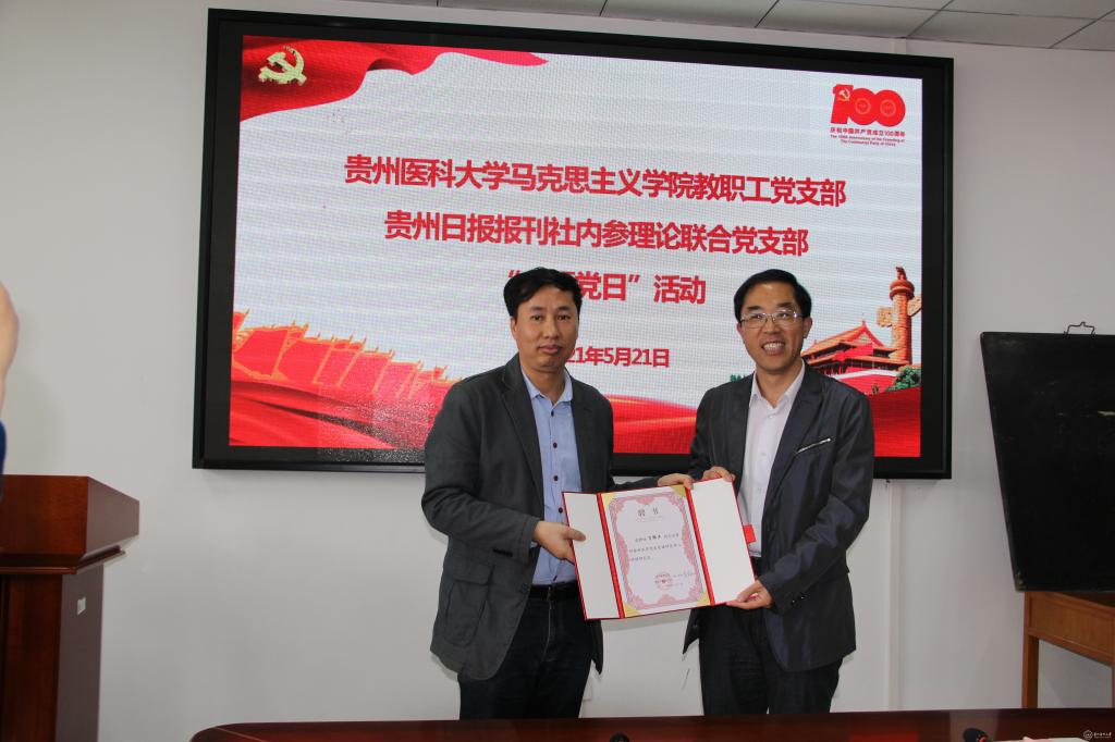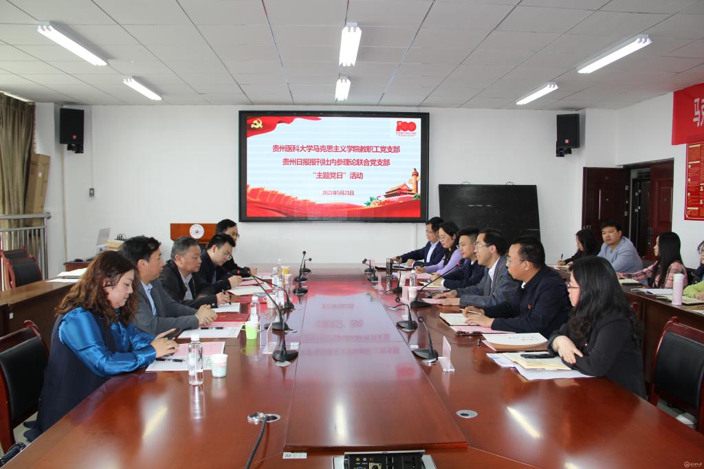 5月21日,马克思主义学院教职工党支部与贵州日报报刊社内参理论联合党支部在善思楼(南)7楼会议室共同开展“主题党日”活动。校党委副书记战勇、贵州日报报刊社理论部主任陈翔出席,马克思主义学院党委委员、正处级组织员、党委办公室(保密办)副主任陆法钢,医学人文学院院长杜凯,贵州日报报刊社内参编辑部副主任肖郎平、徐海星、马克思主义学院党员代表及贵州日报报刊社内参理论联合党支部(以下简称“联合党支部”)全体党员参加“主题党日”活动。活动由陈翔和马克思主义学院党委书记、党史党建研究中心主任黄鑫权共同主持。