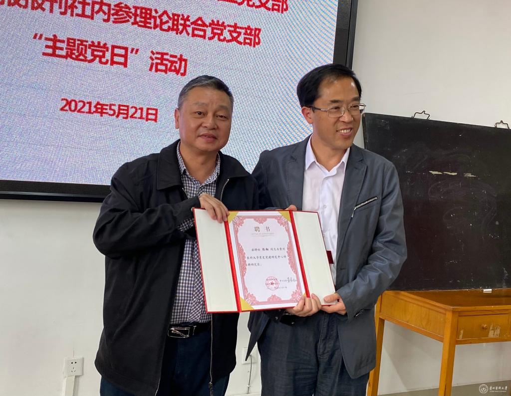 “主题党日”活动中,举行了党史党建研究中心特聘研究员聘任仪式。战勇向陈翔、肖郎平、徐海星3位同志颁发了beat365正版唯一官网必一党史党建研究中心特聘研究员聘书,代表学校感谢贵州日报社长期以来对学校的关心与支持,希望贵州日报社继续关注指导马克思主义学院的建设发展。