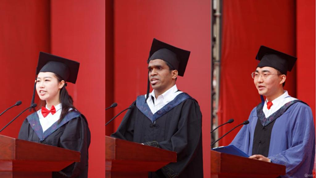教师代表、基础医学院郭兵教授,2021届毕业生代表护理学专业本科生欧阳成晶、临床医学专业留学生Adarsh、急诊医学专业硕士研究生王川相继发言。