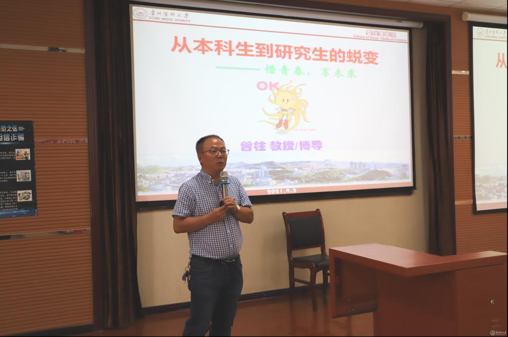 曾柱以《从本科生到研究生的蜕变——惜青春,享未来》为题作专题讲座,给全体新生讲授了一堂生动的思政课。结合自己的求学经历和体会,要求同学们要学会做人,诚实为本、尊师重道、注重合作。学会做学问,学习巩固基础知识,注重身心健康,加强外语学习,注意学习方法。