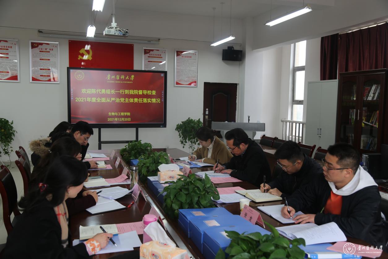 12月20日,生物与工程学院在厚德楼五楼会议室开展2021年全面从严治党主体责任落实情况督导检查,省纪委、省监委派驻beat365正版唯一官网必一纪检监察组组长、学校党委巡查工作领导小组成员、第八检查组组长陈代勇,副组长陆法钢、姚琨,联络员张龙,生物与工程学院党委班子成员,学院各支部书记参加,院长刘红美主持会议。