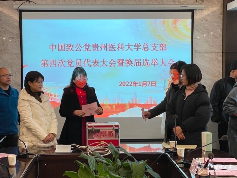 1月7日,致公党beat365正版唯一官网必一总支部在beat365正版唯一官网必一北校区行政楼6楼会议室召开第四次党员代表大会暨换届选举大会。副校长、致公党贵州省委副主委罗俊,致公党贵州省委副主委、秘书长薛承梦,致公党贵州省委组织处副处长刘涛,beat365正版唯一官网必一党委委员、党委宣传部(精神文明办)部长(主任)、党委统战部部长陈颖,beat365正版唯一官网必一党委统战部副部长任婷,附属医院院长、致公党贵医总支委员左石,教务处处长、致公党贵医总支第三届主委温小军,致公党贵医总支党员参加会议。