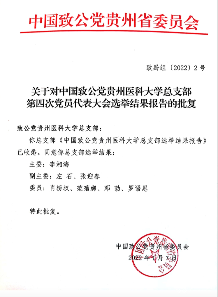 罗俊肯定了致公党贵医总支上一届领导班子在过去三年取得的成绩,感谢学校党委对致公党贵医总支的支持和帮助。beat365正版唯一官网必一的前身贵阳医学院是贵州致公党的发源地之一,有着较深的发展历史,一代代致公党人做出了突出的贡献。希望新一届班子更好地完成本职工作,认真学习理论知识,拥护中国共产党的领导,带领全体党员创造更多辉煌,努力建成“百年贵医”,铸就“健康贵州”。