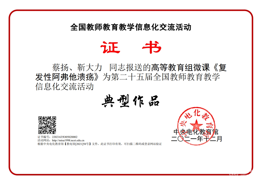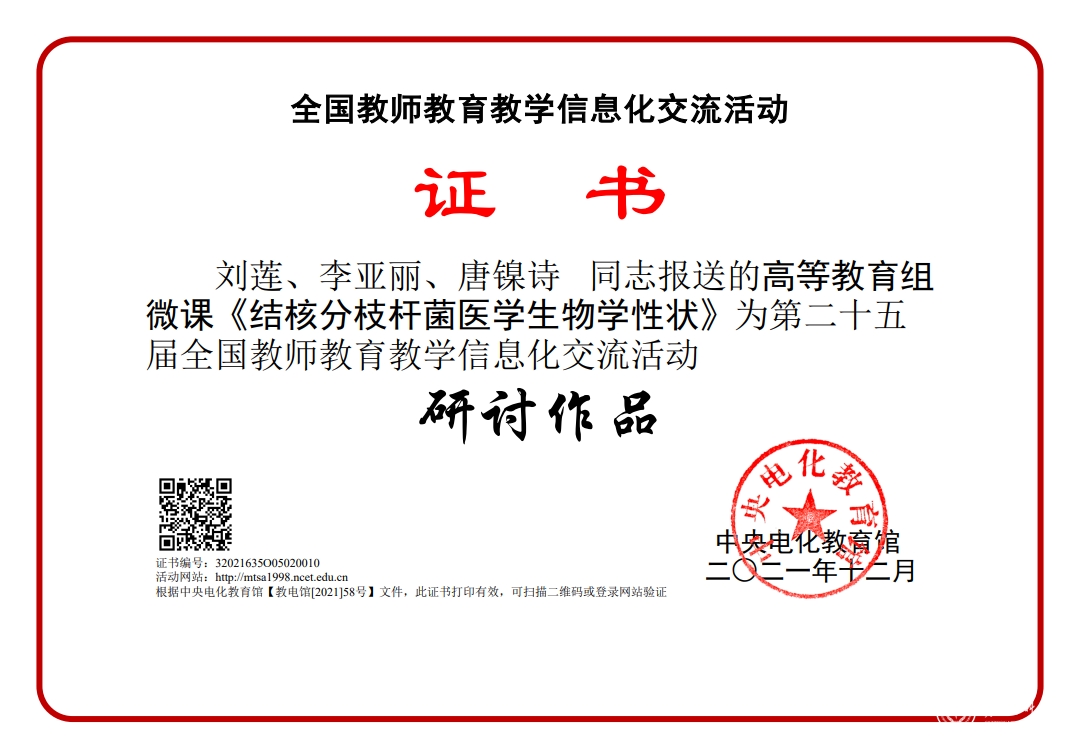 近日,由教育部指导、中央电化教育馆主办的第二十五届全国教师教育教学信息化交流活动落下帷幕。在教务处、电化教学中心的精心组织下,学校教师踊跃报名,积极参与。经过激烈角逐,beat365推荐报送的10个作品参加本届交流活动,4个作品获得典型作品奖,3个作品获得研讨作品奖。其中临床医学院赵粟团队、口腔医学院蔡扬团队、基础医学院熊英团队、beat365正版唯一官网必一附属医院唐炜团队报送的作品获得本届交流活动典型作品奖。医学检验学院刘莲团队、护理学院马丽团队、医学影像学院朱玥团队报送的作品获得本届交流活动研讨作品奖。