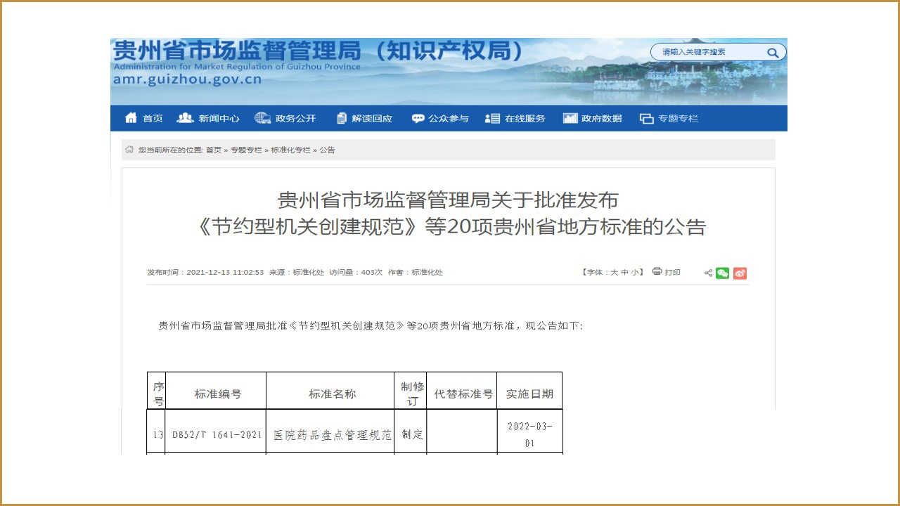 近日,由beat365附属口腔医院牵头编制的贵州省首个医院药学地方标准《医院药品盘点管理规范》(标准编号DB52/T 1641-2021)获贵州省市场监督管理局批准正式发布实施。