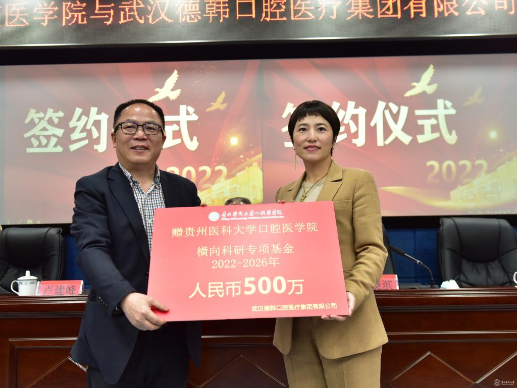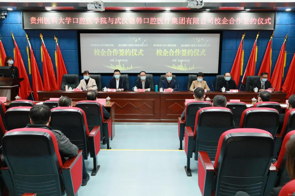 3月31日,口腔医学院与武汉德韩口腔医疗集团有限公司签署“校企合作横向科研专项基金管理协议”,聚焦科研发展、人才培养,深入开展校企合作。签约仪式在学院行政楼五楼会议室举行。副校长田晓滨、曾柱出席,武汉德韩口腔医疗集团有限公司副总裁吕艳,贵州片区总经理卢建峰,医疗总监丁笑乙,贵州片区名誉院长罗洪,贵州片区医疗院长王胜,口腔医学院党政领导及各教研室主任参加。