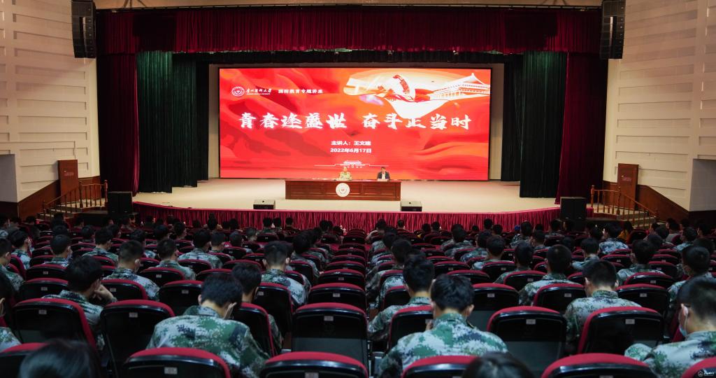 王文建以“青春逢盛世,奋斗正当时”为题,围绕青春选择、青春规划、青春担当三个方面进行讲授。他强调,在百年未有之大变局和中华民族伟大复兴全局中,青年必须在场,要自觉找准定位、做好选择,勇于承担国家和民族振兴的责任使命。他结合国家和地方征兵入伍政策及实际工作情况,勉励同学们珍惜时光,做有理想、有追求、敢拼敢闯的新时代青年,扎根军营沃土,在军队的大熔炉里学习成才,用新的奋斗史续写党的百年光辉。