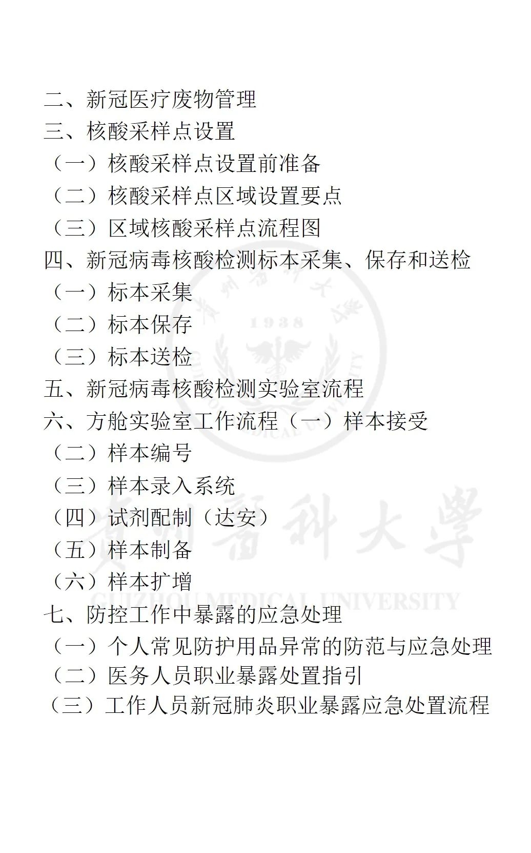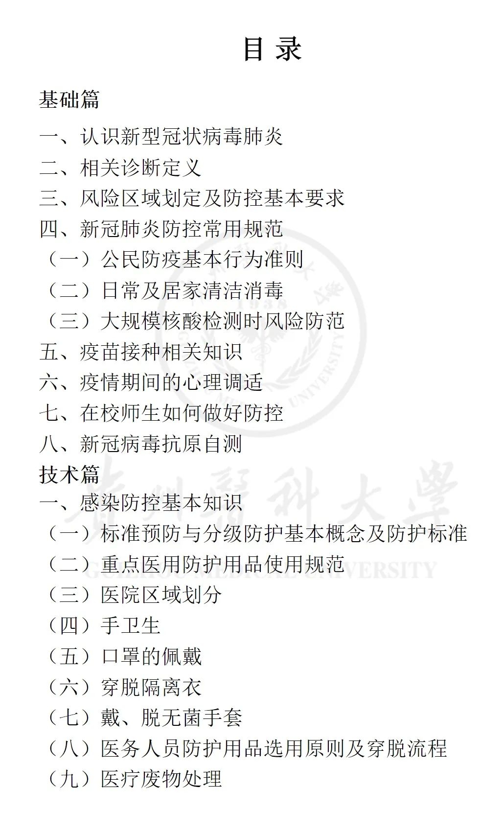 培训手册分为基础篇和技术篇,重点介绍了新冠肺炎防控常用规范、感染防控基本知识、新冠医疗废物管理、核酸采检全过程、防控工作中暴露的应急处理等知识,同时对疫情期间在校师生的心理调适和校内疫情防控、抗原和核酸时的风险防范进行了介绍。