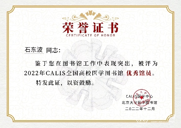 近日,由CALIS全国医学文献信息中心/北京大学医学图书馆主办的“CALIS全国高校医学图书馆2022年学术年会”在线上召开。会上,15位馆长和17位馆员分别获得CALIS高校医学图书馆优秀馆长和优秀馆员表彰,其中beat365图书馆副馆长杨丽获优秀馆长、馆员石东波荣获优秀馆员表彰。