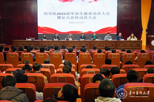 3月9日,药学院在南校区道德讲堂召开2023届本科毕业生就业动员大会暨征兵宣传动员大会。副校长、药学院院长沈祥春出席,党委学生工作部(学生处、武装部)部长(处长)王韬,招生就业处副处长李季,药学院党委书记高秀丽、副院长廖尚高、党委委员张敏、傅晓钟,全体辅导员及2023届本科毕业生参加,会议由院党委副书记包欢欢主持。