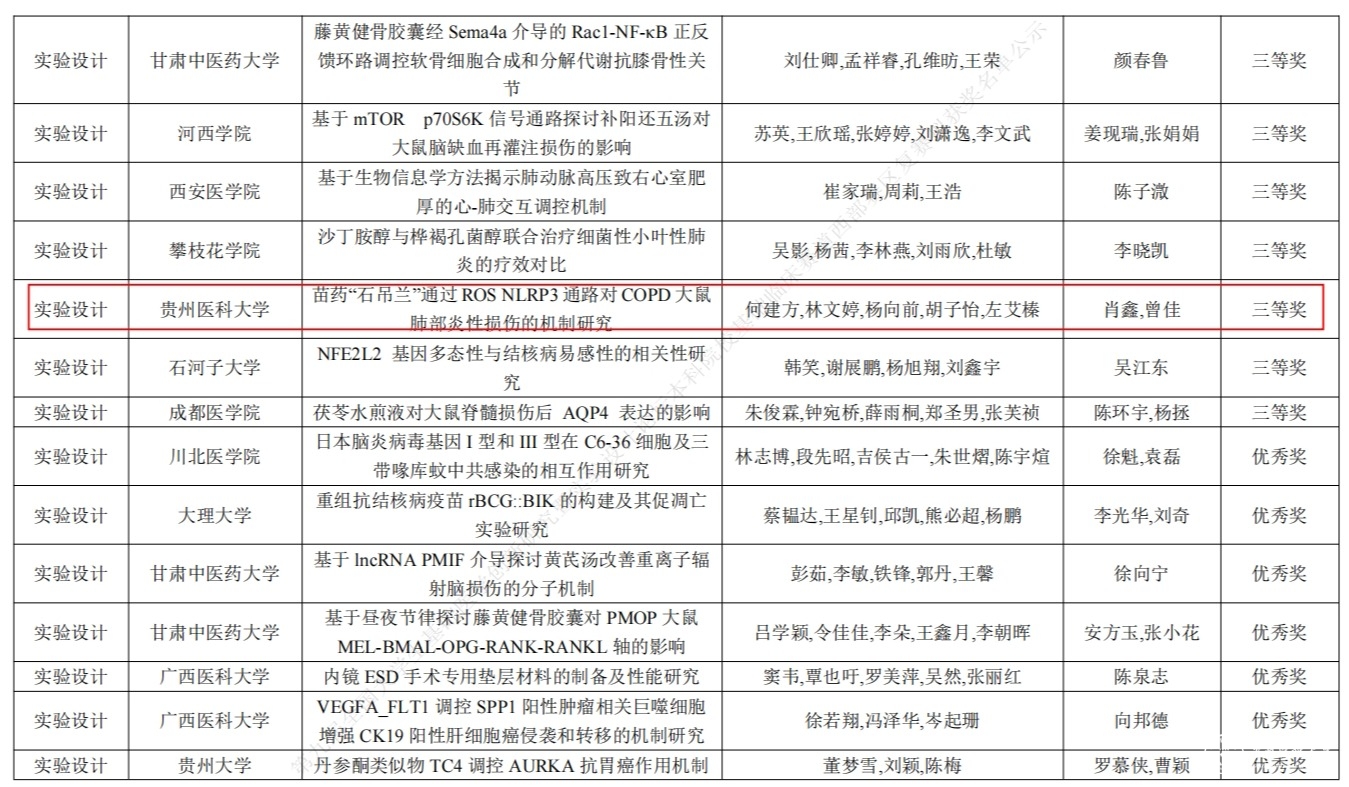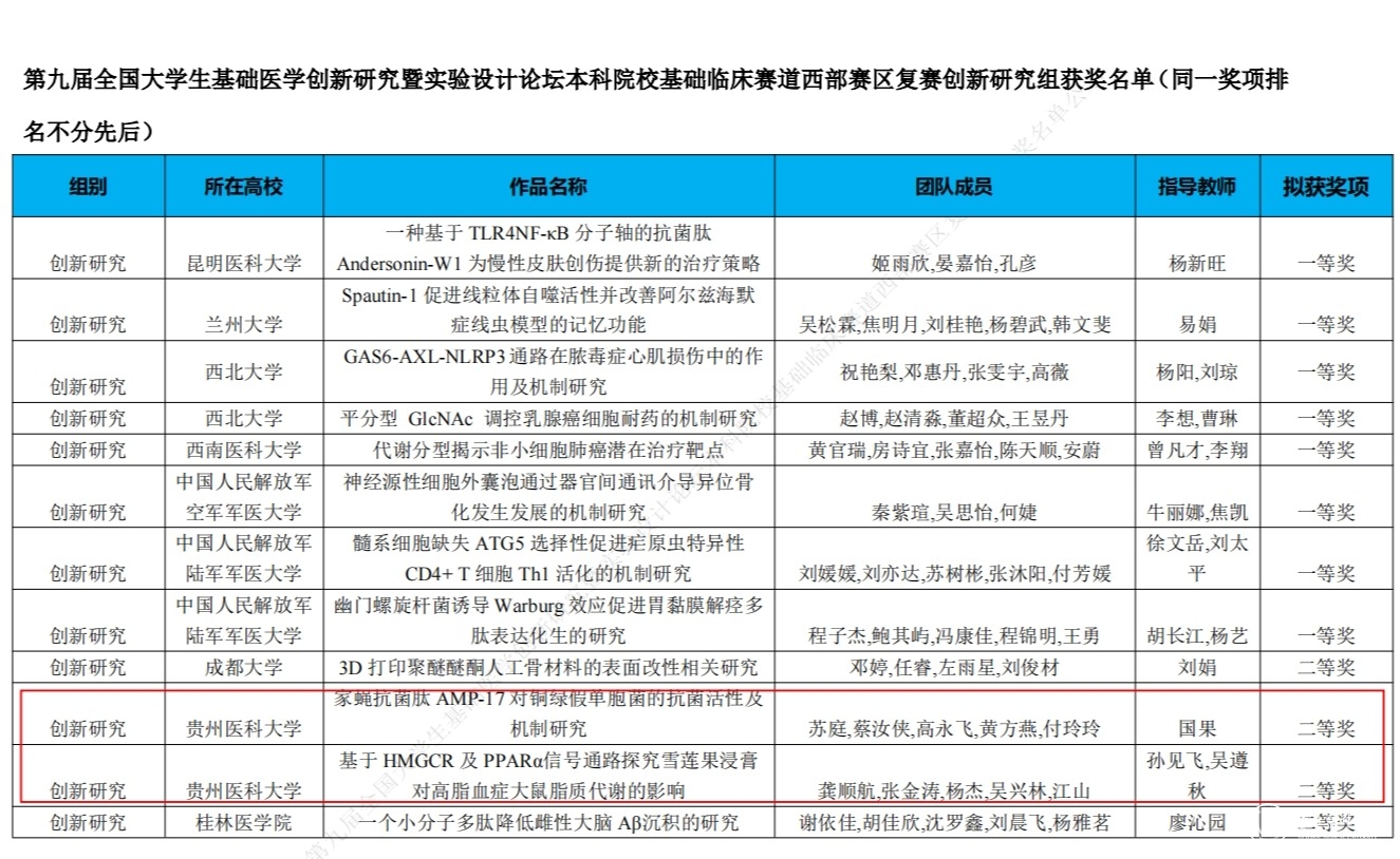 近日,由高等学校国家级实验教学示范中心联席会基础医学组主办、宁夏医科大学承办的第九届全国大学生基础医学创新研究暨实验设计论坛本科院校基础临床赛道西部赛区选拔赛在宁夏医科大学圆满结束。beat365教师、学生积极参与,赛前参赛团队和指导老师对参赛作品不断打磨与演练,赛中参赛团队表现优异,选送参赛的6项作品全部获奖。其中,家蝇抗菌肽AMP-17对铜绿假单胞菌的抗菌活性及机制研究(团队成员:苏庭,蔡汝侠,高永飞,黄方燕,付玲玲;指导教师:国果)和基于HMGCR及PPARα信号通路探究雪莲果浸膏对高脂血症大鼠脂质代谢的影响(团队成员:龚顺航,张金涛,杨杰,吴兴林,江山;指导教师:孙见飞,吴遵秋)荣获创新研究组别二等奖;基于皮质酮-炎性反应-线粒体网络探究急性高缺氧对抑郁症大鼠海马区影响及作用机制(团队成员:张广鹏,于嘉璐,冉璐,武庆中,彭勃;指导教师:钟曦,许志玲)荣获实验设计组别二等奖;组蛋白去甲基化酶LSD1通过调控pre-mRNA可变剪接促进生长卵泡发育的机制研究(团队成员:夏大甜,罗炜思,毛自强,王泽宇,陈游铭记;指导教师:张拓,何美娜)、USF2调控SNHG5与miR-181b-5p的内源性竞争在神经病理性疼痛中的作用机制(团队成员:崔家田,王超颖,黄颖荷,黄明宇,曾珊;指导教师:陈觅)和苗药“石吊兰”通过ROSNLRP3通路对COPD大鼠肺部炎性损伤的机制研究(团队成员:何建方,林文婷,杨向前,胡子怡,左艾榛;指导教师:肖鑫,曾佳)荣获实验设计组别三等奖。