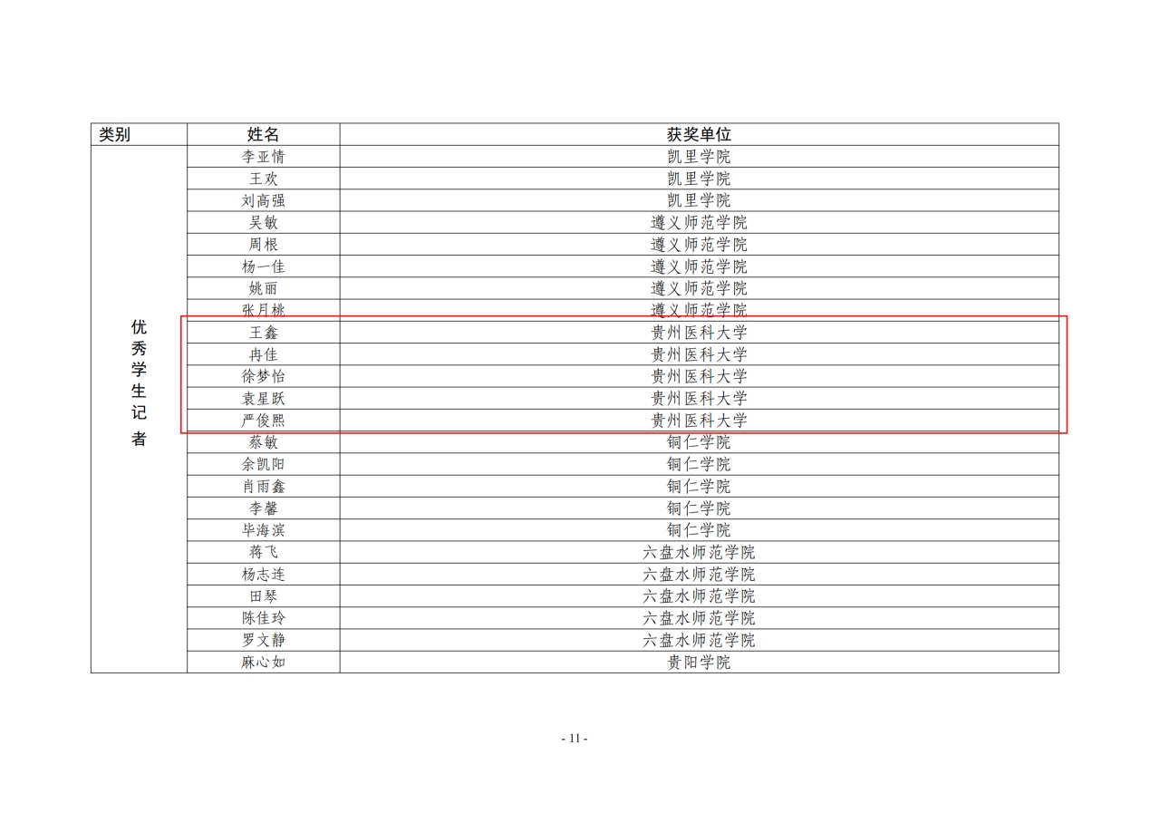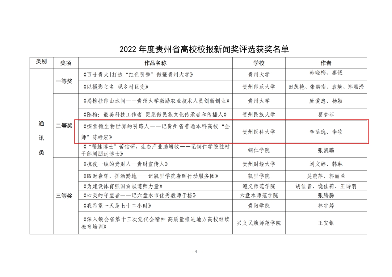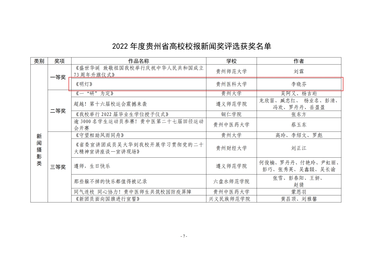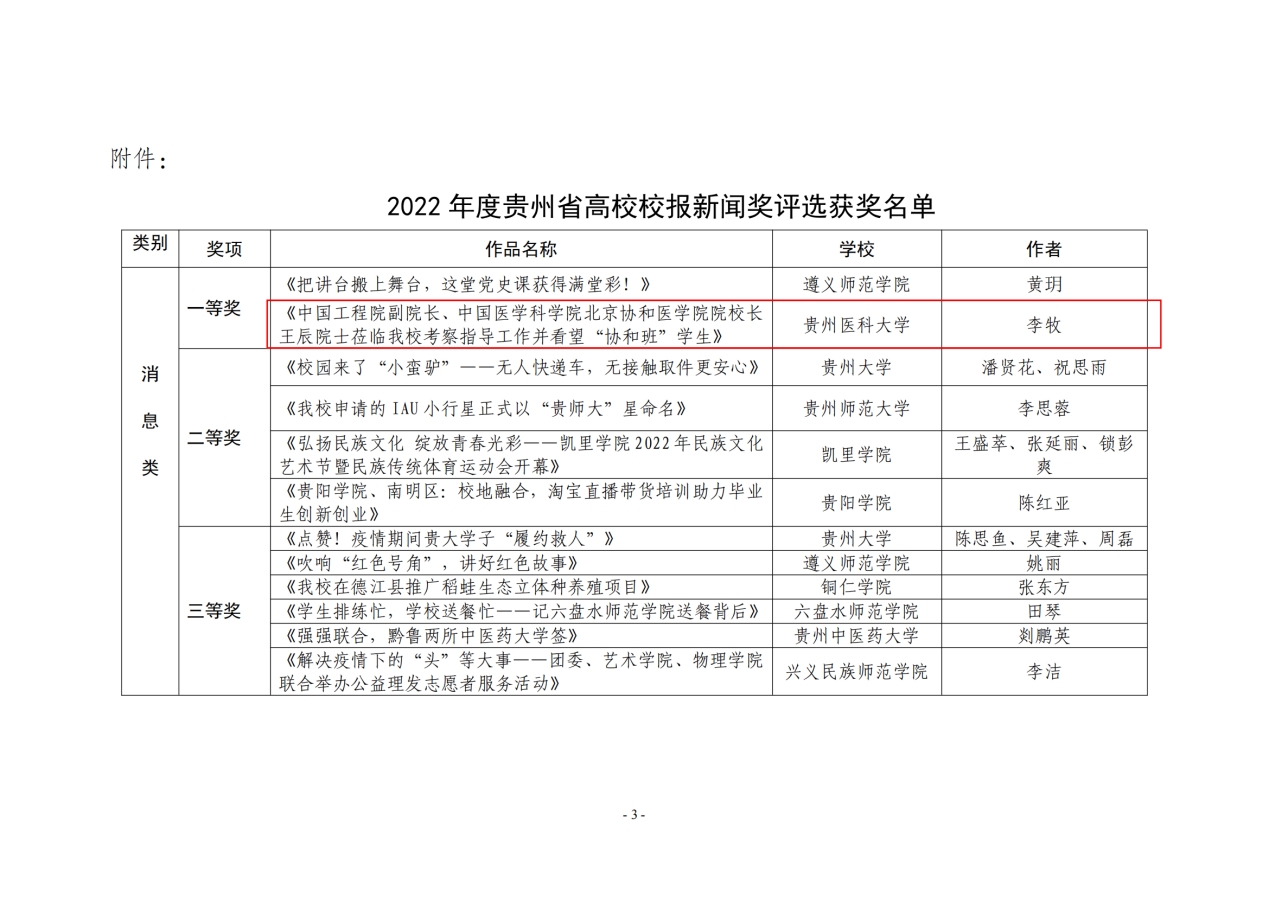 李牧《中国工程院副院长、中国医学科学院北京协和医学院院校长王辰院士莅临beat365考察指导工作并看望“协和班”学生》获消息类一等奖,李晓芬《明灯》获新闻摄影类一等奖;李菡逸、李牧《探索微生物世界的引路人——记贵州省普通本科高校“金师”陈峥宏》获通讯类二等奖,张弛《青春之花怒放于红色土地》获言论类二等奖;田珊、汪彤、韦忠玉、田芷蕊《beat365正版唯一官网必一报2022年9月30日第3版》获版面类三等奖;王鑫、冉佳、徐梦怡、袁星跃、严俊熙获“优秀学生记者”称号。