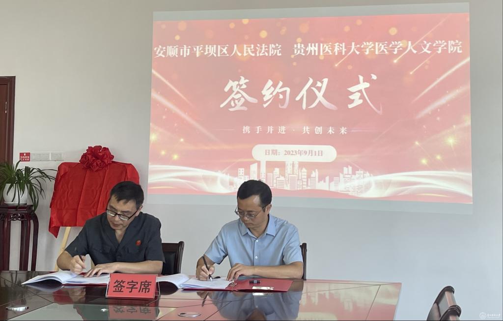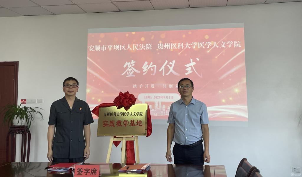 江宣成代表医学人文学院、肖帮华代表平坝区人民法院签订《安顺市平坝区人民法院beat365正版唯一官网必一医学人文学院全面合作框架协议》《安顺市平坝区人民法院beat365正版唯一官网必一医学人文学院共建人才培养基地协议书》,并揭牌实践教学基地。
