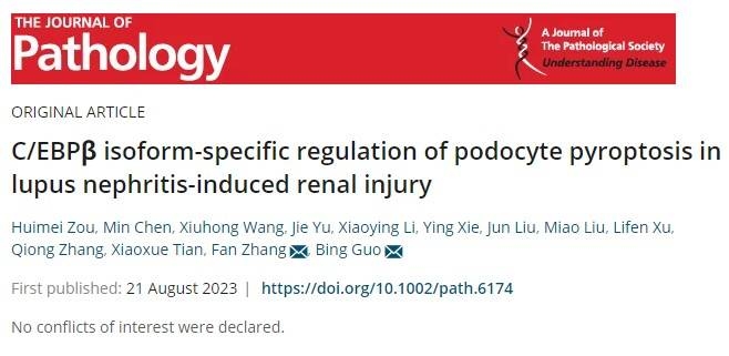 beat365基础医学院贵州省常见慢性疾病发病机制及药物研究重点实验室,病理生理学教研室郭兵教授团队在狼疮肾炎肾小球损伤机制研究方面取得新进展,相关研究成果以“C/EBPβ isoform-specific regulation of podocyte pyroptosis in lupus nephritis-induced renal injury”为题发表在国际病理学权威学术期刊《The Journal of Pathology》上,该期刊于1892年在英国伦敦创刊,距今已有130年的历史。