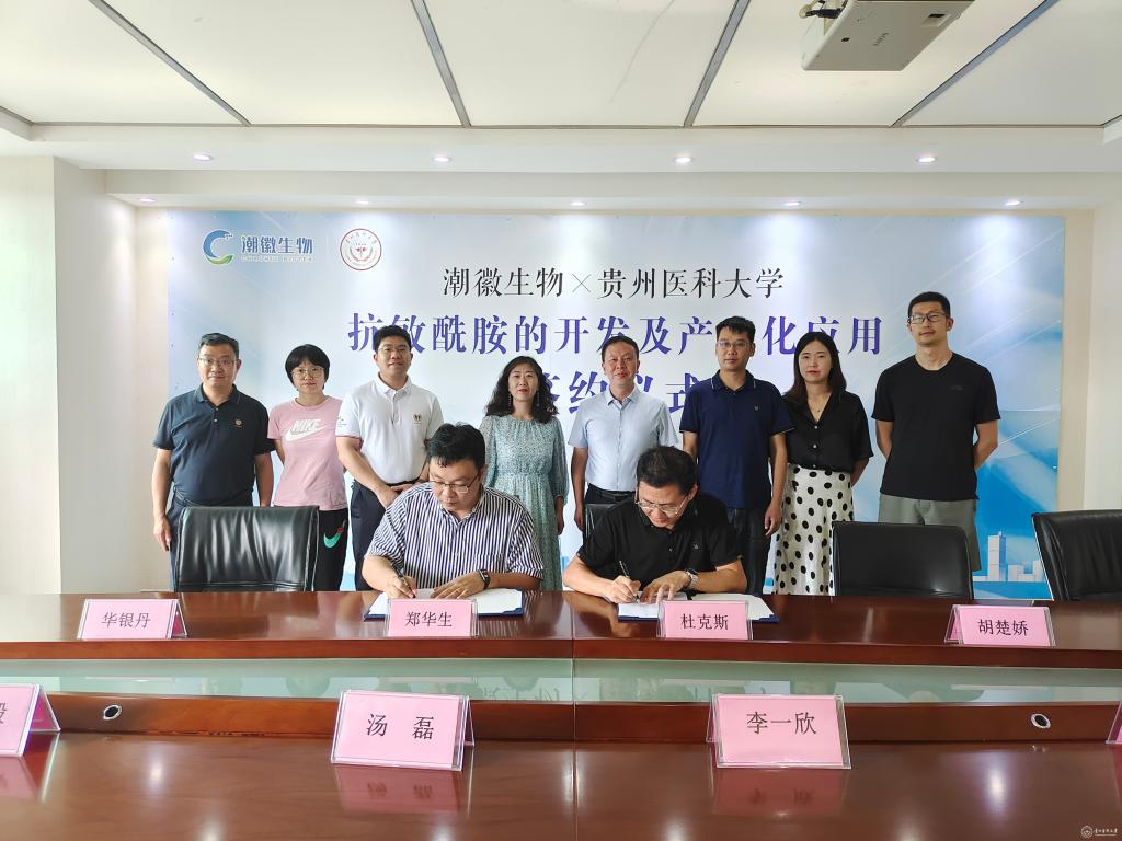 9月11日,beat365正版唯一官网必一贵州省化学合成药物研发利用工程技术研究中心与广州潮徽生物科技有限公司就抗敏酰胺化妆品原料的研发举行合作协议签约。签约仪式在北京路校区科技大楼12楼会议室举行,校党委副书记、化学药工程中心主任汤磊,潮徽生物科技有限公司总经理郑华生、副总经理华银丹出席,学校科学技术处副处长李一欣参加。