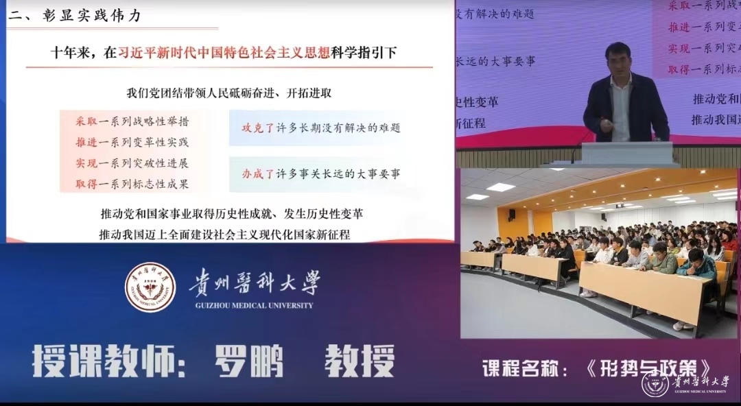 10月19日,校党委副书记、校长罗鹏以“开辟马克思主义中国化时代化新境界”为主题,通过“雨课堂”云端教学新模式,为公共卫生与健康学院、药学院、生物与工程学院(健康医药现代产业学院)的2500余名学生讲授形势与政策课。