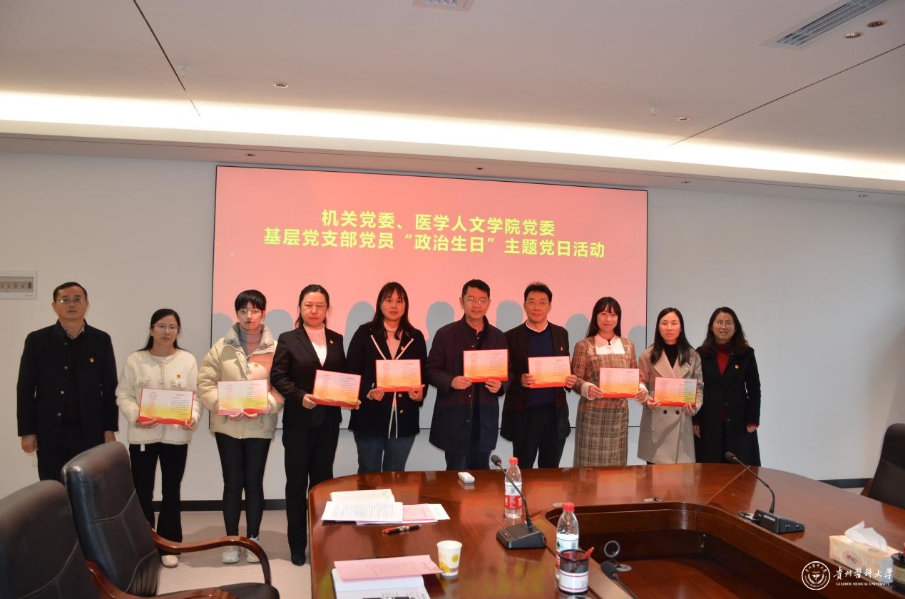 邓舟为过政治生日的8位党员致贺辞。医学人文学院教工第一党支部党员韩杰炜同志作为代表重温“入党志愿书”。