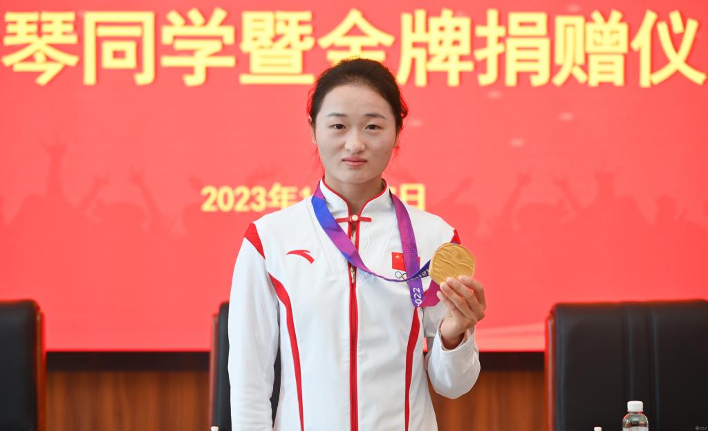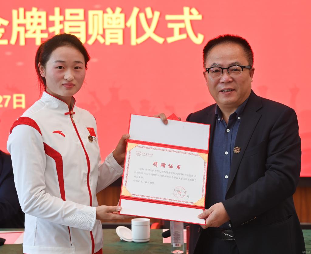 汤磊代表学校接受亚运会攀岩女子速度接力赛冠军金牌捐赠。