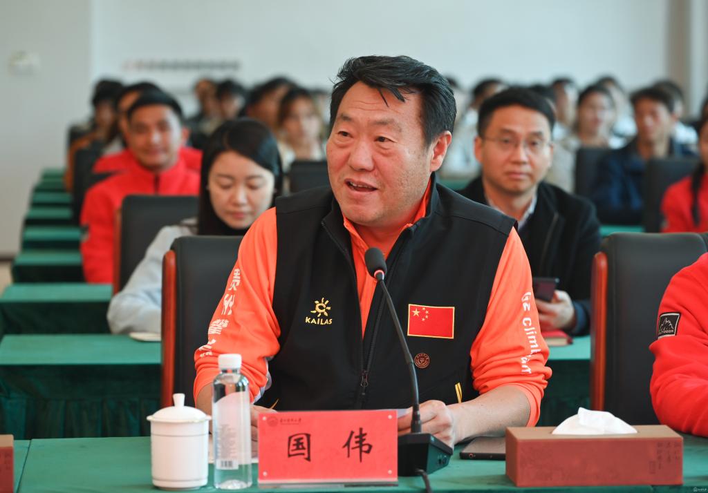 国伟介绍攀岩队发展情况,汇报近年来beat365在户外教育、户外运动、救援救护和山地旅游等方面,在攀岩、滑板、定向和轮滑等项目的成绩成果。