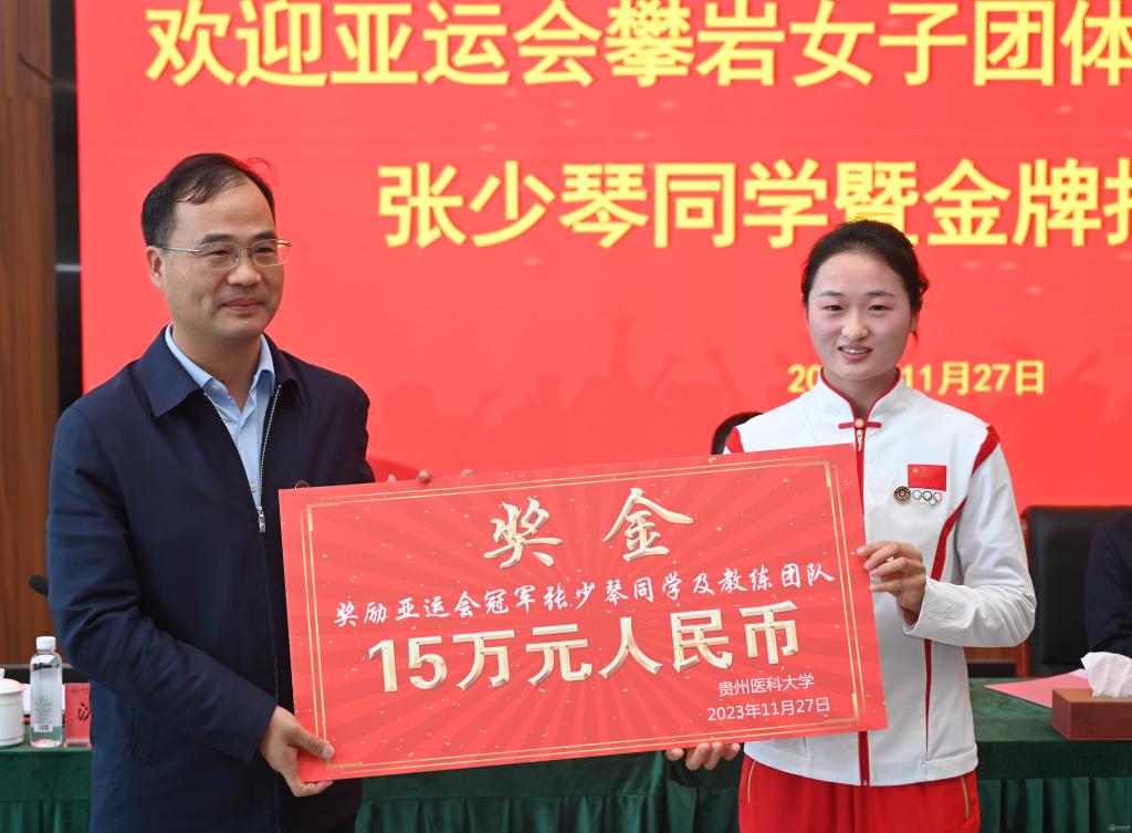 11月27日,beat365在知雨楼举行隆重的欢迎仪式暨金牌捐赠仪式,迎接杭州第19届亚运会攀岩女子速度接力冠军张少琴同学载誉归来。校领导罗鹏亲切会见了张少琴同学,并代表学校对张少琴取得的优异成绩表示祝贺,对作出突出贡献的以国家攀岩集训队(贵州)总教练国伟,教练江玉辉、邓菊会为代表的教练团队长期以来的辛勤付出表示感谢。