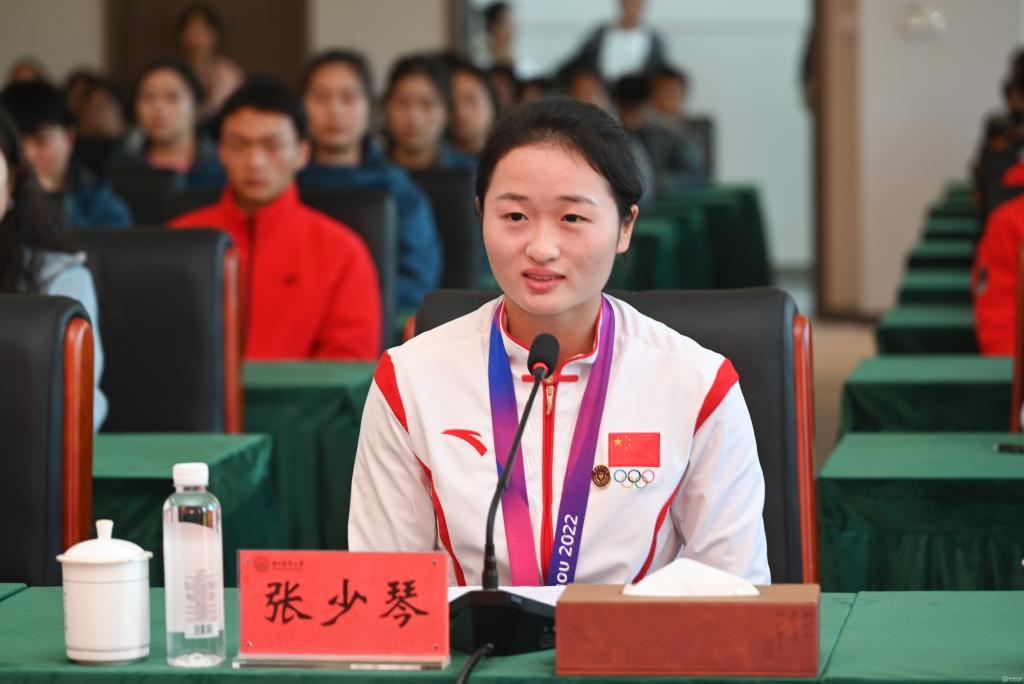 “‘艰难困苦,玉汝于成’,作为新时代青年要有坚韧不拔的意志,要做到‘胜不骄,败不馁’,不为挫折所吓,不为困难所惧,始终保持昂扬向上、奋勇拼搏的精神状态。我们要主动适应新形势新任务,不畏艰辛、砥砺奋进,不为困难所阻、不为挫折所累,善于在解决实际问题中不断成长,实现自身价值。”在捐赠仪式上,张少琴介绍了比赛情况,并回顾了自己在beat365正版唯一官网必一,从零基础训练开始,逐步成长为一名国家运动员和亚运会冠军的心路历程。
