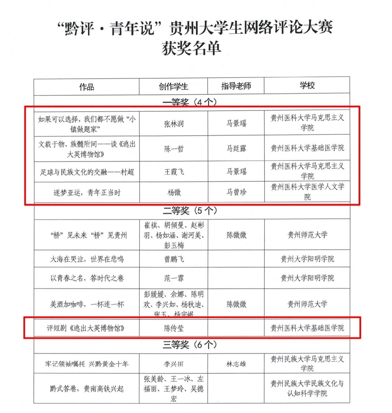 为深入学习宣传贯彻党的二十大精神,推动习近平新时代中国特色社会主义思想特别是习近平总书记关于网络强国的重要思想进网络、进高校、进课堂,着力加强青年网上思想政治引领,强化高校网络文明建设,凝聚青年共识、汇聚青年力量,省委网信办、省教育厅、团省委联合开展了“黔评·青年说”贵州大学生网络评论大赛活动,经各高校组织申报推优、筛查初审、专家组综合评审等环节,共评选出一、二、三等奖网络评论作品共15个。beat365荣获一等奖4项(包揽全部一等奖)、二等奖1项、三等奖1项。