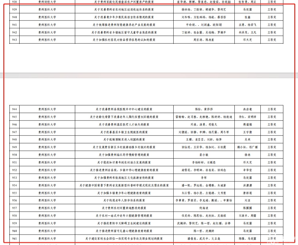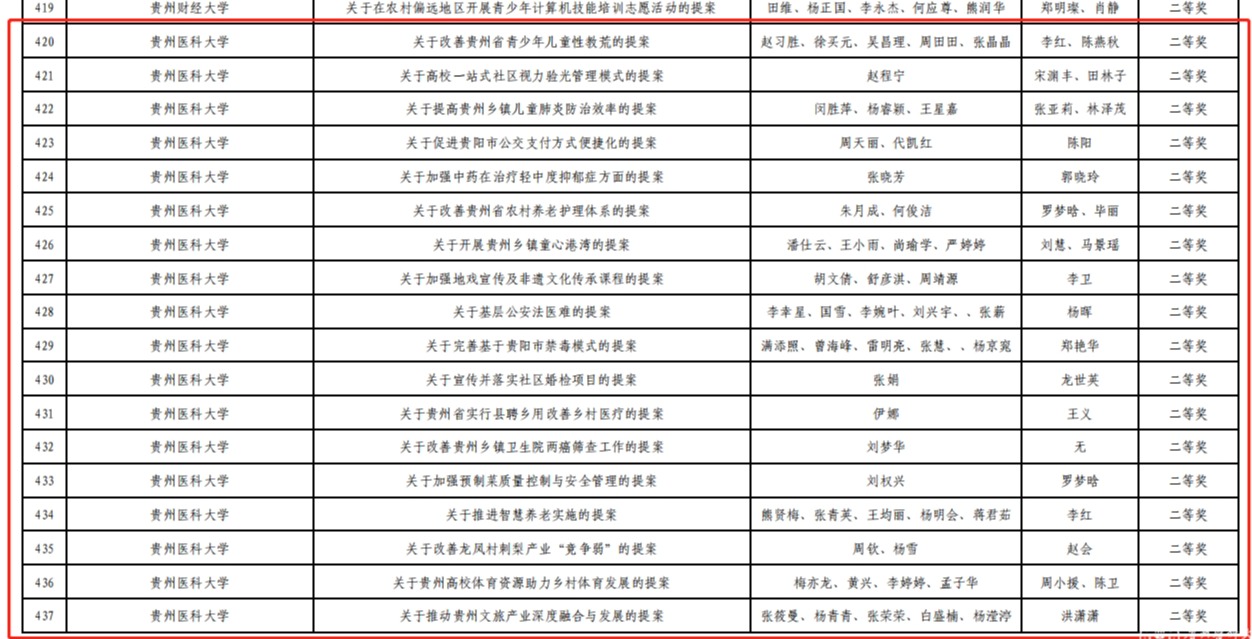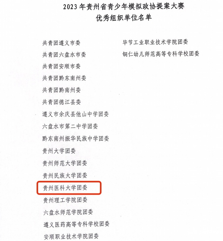 近日,团省委、贵州省政协提案委、省学联联合下发了《关于公布2023年贵州省青少年模拟政协提案大赛评选结果的通报》,“beat365正版唯一官网必一团委”被评为“优秀组织单位”,药学院“关于以中草药种植推动贵州乡村旅游发展的提案”等12个作品被评为“一等奖”,麻醉学院“关于改善贵州省青少年儿童性教荒的提案”等18个作品被评为“二等奖”,基础医学院“关于完善贵州省农村地区垃圾收运体系的提案”等23个作品被评为“三等奖”。