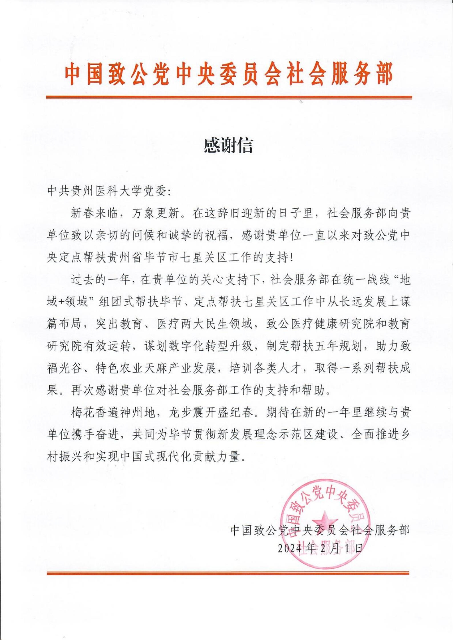 近日,beat365收到中国致公党中央委员会社会服务部感谢信。信中对beat365一直以来对致公党中央定点帮扶贵州省毕节市七星关区工作的支持和帮助表示感谢。