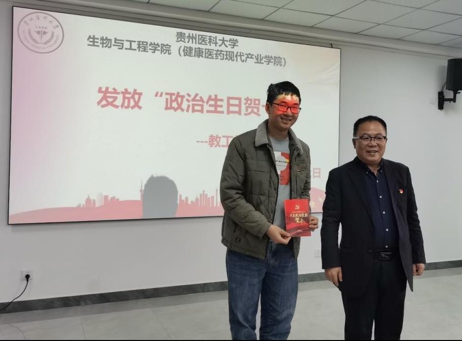 曾柱为仇志浪、刘利利发放了政治生日贺卡,勉励他们作为青年教师,要在教学科研岗位上不忘初心、牢记使命、砥砺前行。