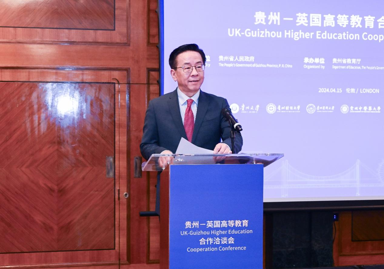 贵州省委常委、省委宣传部部长、省委教育工委书记卢雍政出席并致辞,他指出,贵州始终保持着开放的态度,不断深化与英国在各方面的交流合作。在教育领域,贵州与英国的交流合作结下累累硕果,在校际交流、师生交流、人才培养等方面的合作取得显著成效,5所贵州学校已与英国学校共建5个中外办学项目。他特别介绍了多彩贵州的独特魅力和教育发展的良好态势,并表示期待未来双方在高层次人才的联合培养、加大外籍教师引入力度、拓宽科研项目的国际合作、助力贵州提升英语基础教育水平等多个方面开展深度合作,贵州将以最大诚意、最优服务为双方合作助力,促进更深层次、更高质量、更加安全的教育合作。