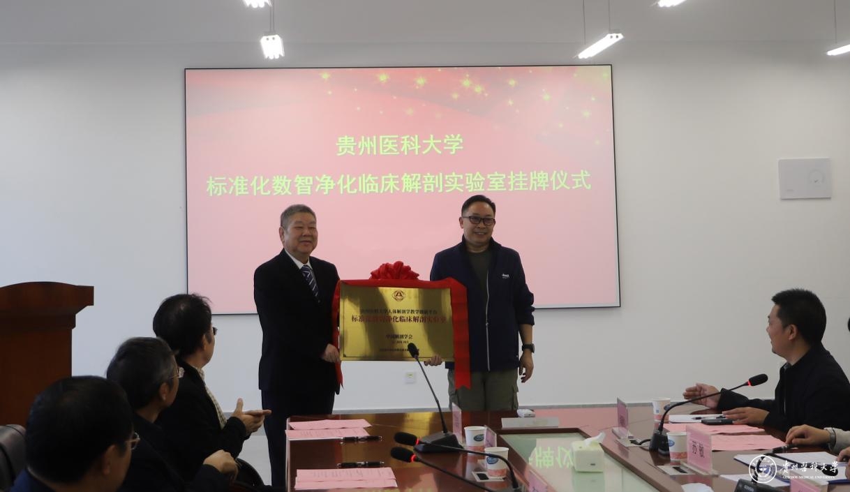 近日,中国解剖学会理事长、空军军医大学李云庆教授,中国解剖学会监事长、上海交通大学医学院丁文龙教授,中国解剖学会副理事长、河北医科大学原校长崔慧先教授,中国解剖学会副理事长、海南医学院易西南教授,南方医科大学丁自海教授,华亿科教董事长陆志萍女士,华亿科教总裁黄晓祥先生等一行7人为beat365标准化数智净化临床解剖实验室挂牌,挂牌仪式在云漫湖校区解剖楼五楼会议室举行,副校长曾柱,基础医学院院长禹文峰,基础医学院副院长余资江,贵州省解剖学学会理事长、组织工程与干细胞实验中心主任苏敏,人体解剖学教研室主任孙宝飞,人体解剖学教学实验中心主任肖朝伦及解剖学科全体教师参加。挂牌仪式由苏敏主持。