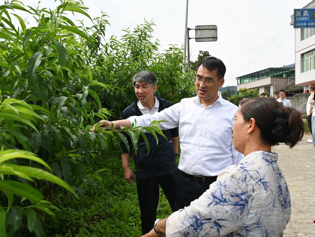 会前,罗鹏一行到新美村实地考察,详细了解新美村黄桃种植林的情况及农户的增收情况,查看了驻村工作队的办公、住宿条件,勉励他们继续为驻村群众多做好事、多办实事。