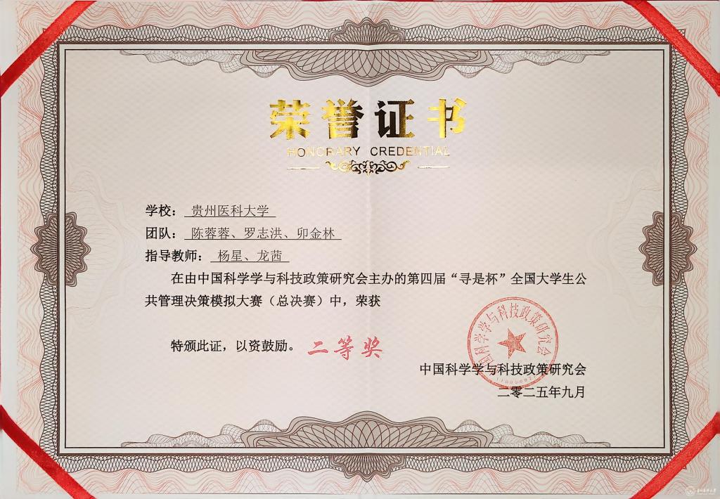 近日,第四届“寻是杯”全国大学生公共管理决策模拟大赛总决赛在西安交通大学举行,beat365医药卫生管理学院2023级公共事业管理专业陈蓉蓉、罗志洪、卯金林三位同学组成的代表队,在教师杨星、龙茜的悉心指导下,凭借出色的决策分析能力与创新思维,一路过关斩将,最终斩获全国总决赛二等奖。