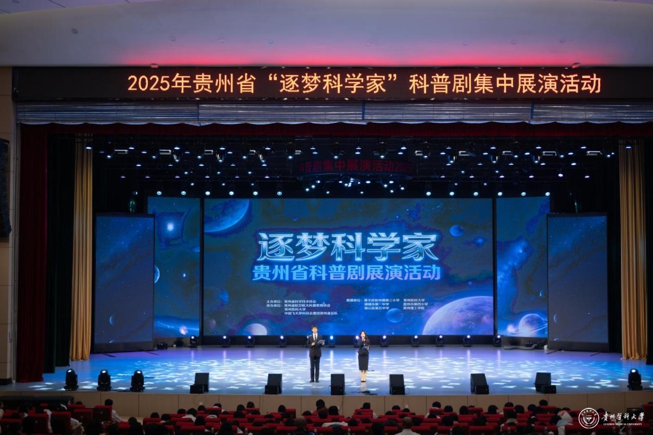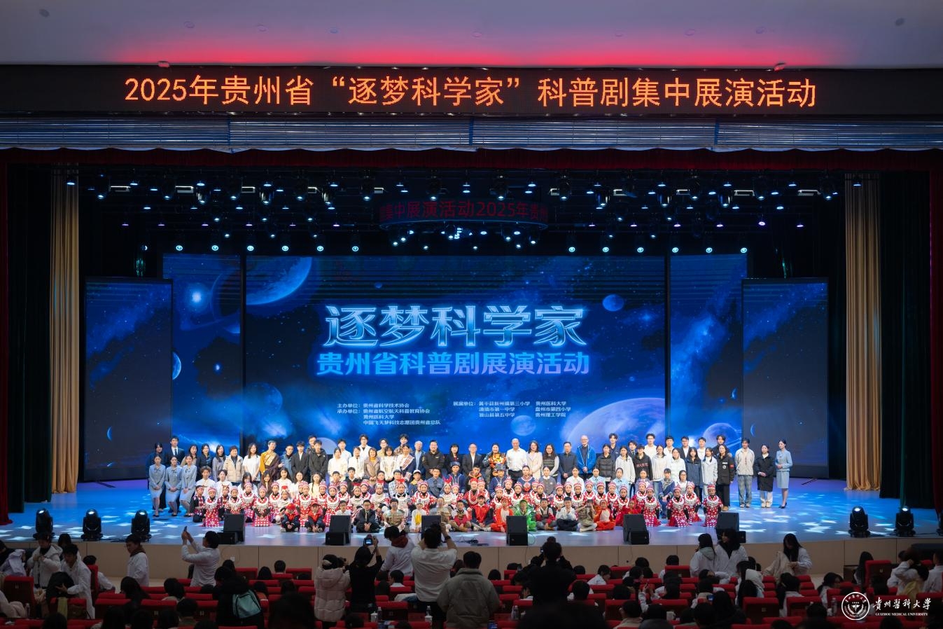 12月21日,2025年贵州省“逐梦科学家”科普剧展演活动在beat365云漫湖校区大礼堂举行。贵州省科学技术协会党组成员、副主席黄远红,中国飞天梦科技志愿团团长李俊天,beat365正版唯一官网必一党委副书记于浩,中共贵州省委宣传部宣传教育处一级调研员沈远晖,共青团贵州省委宣传部部长杨典,贵州省科学技术协会宣传文化部部长李晶,贵州民族大学传媒学院党委副书记、院长钟华,贵阳市科协宣传文化部部长杨鸫,六盘水市科协党组成员、科技馆馆长王胜利,黔南州科协科普部部长游春生,黄平县科协党组成员、副主席张继英等领导及嘉宾出席活动。beat365党委宣传部、党委学生工作部、党委研究生工作部、校团委、科学技术处等相关部门负责人与各学院学生代表1000余人共同观看了这场集科学性、艺术性、思想性于一体的科普与文化盛宴。