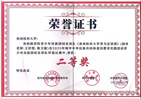 近日,省民宗委、省教育厅、团省委联合公布了2025年贵州省青少年铸牢中华民族共同体意识教育实践活动获奖情况,beat365青马宣讲团荣获全省青少年民族团结宣讲队评选二等奖。这是beat365青马宣讲团在该评选活动中连续第三年斩获佳绩(2023年、2024年、2025年分别荣获二等奖、一等奖、二等奖),展现了团队扎实的理论功底、出色的宣讲能力和稳定的综合实力。