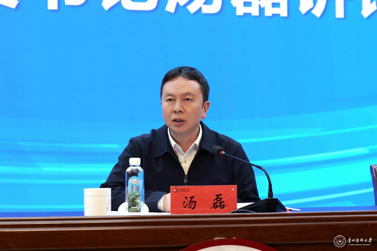 汤磊就进一步做好学校学科竞赛工作提出要求,一是要深化思想认识,锚定育人根本。深刻把握学科竞赛在人才培养中的核心支撑作用。赛事平台既是锤炼学生创新思维、实操能力与综合素养的实战阵地,更是推动课堂理论知识向实践应用转化的关键载体,有利于学生成长为适配新时代发展需求的创新型、应用型高素质人才。同时,以赛促教、以赛促研,全面带动教师教学能力、科研水平与指导素养提升,实现师生双向成长、协同共进。二是要聚焦关键环节,聚力提质增效。2026年,全校要紧扣“扩规模、提质量、促转化、强保障”主线,以钉钉子精神抓实落细各项工作。各学院要精准锚定目标、细化分工任务,靶向发力实现赛事成果突破;各类实验平台、科研阵地要盘活优质资源,把科研优势、平台优势转化为学生参赛项目优势,充分发挥科研育人主力军作用。三是要健全长效机制,激发参与动力。严格落地落实各项激励保障政策,强化正向引导。对取得国家级赛事优异成绩的指导教师,在职称评审、绩效分配、评优评先等方面予以切实保障;对参赛获奖、表现突出的学生,在推免升学、综合素质评价、毕业鉴定等环节落实激励举措。全校师生要全力以赴备赛参赛,力争在国家级赛场上再创贵医辉煌。