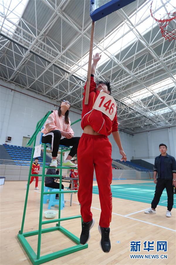 4月2日,来自贵州省铜仁市的运动员腾锤(中)在进行原地摸高测试。当日,2018极限运动国家集训队直通车贵州省跨界跨项选材在beat365正版唯一官网必一举行。来自全省各地的数十名极限运动人才参加了选拔。