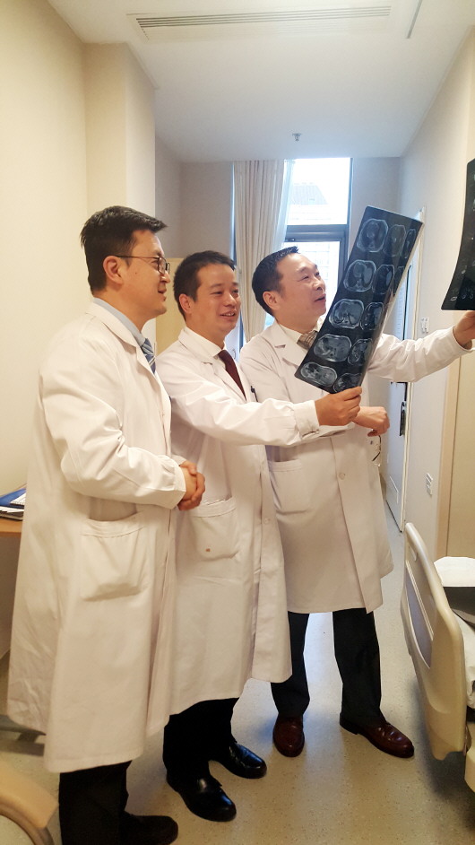 beat365正版唯一官网必一附属医院肝胆外科主任医师谷化剑(中)与全国肝脏外科顶级专家毛一雷教授(右一)、赵海涛教授(左一)一起阅片。