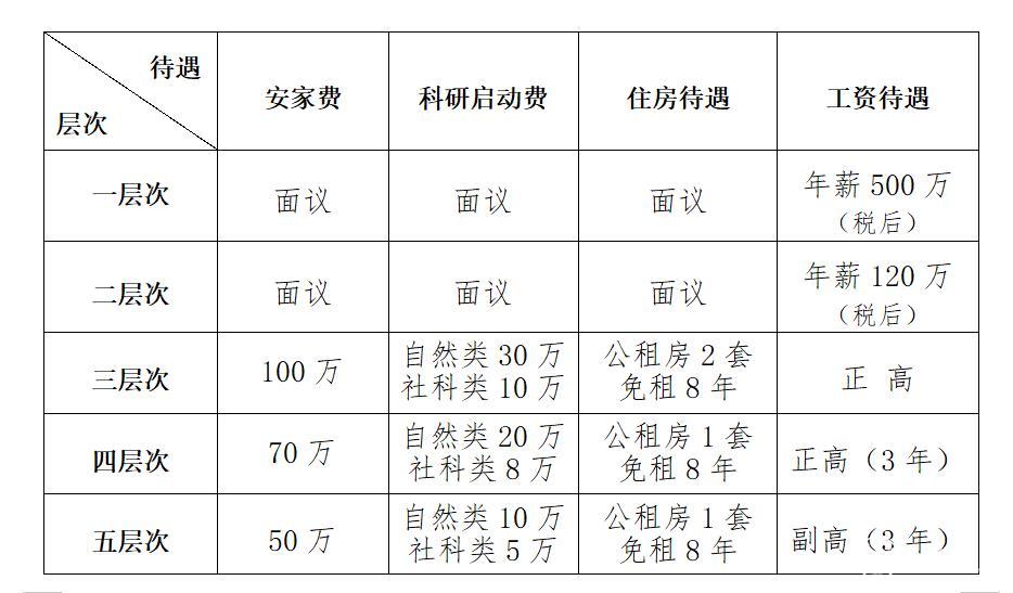该校拟引进的最低五层次人才为享受学校副高工资待遇,安家费50万,科研启动费自然类10万,社科类5万,以及免租8年的公租房1套。