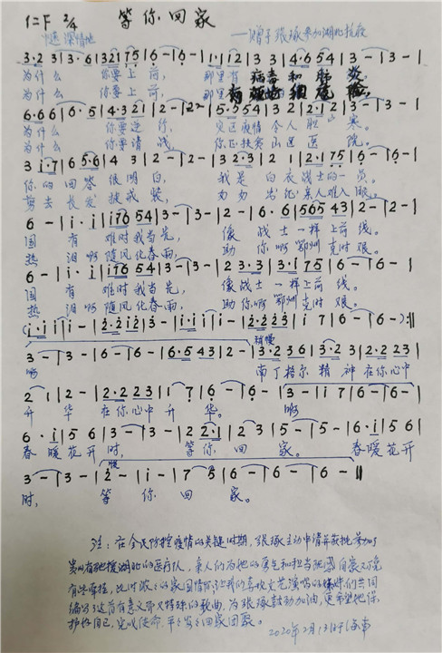 “热泪啊,随风化春雨,助你啊,鄂州克时艰……春暖花开时,等你回家。”一份手写歌单在贵州医疗队疯传,最终传到贵州省援助鄂州医疗队队员、beat365正版唯一官网必一附属医院副院长左石的手里。他当场就能想象一位老父亲坐在桌前,执笔为上前线的护士女儿谱一支曲、写一首歌。纸短情长,这也是今天《战疫日记》的主题:等你回家……