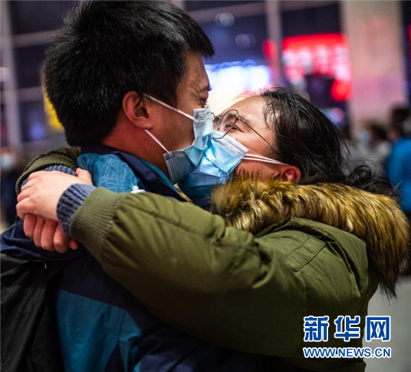 2020年2月11日,贵州对口支援湖北鄂州医疗队337名队员出征。图为医疗队队员在机场和家人吻别。新华社记者陶亮摄